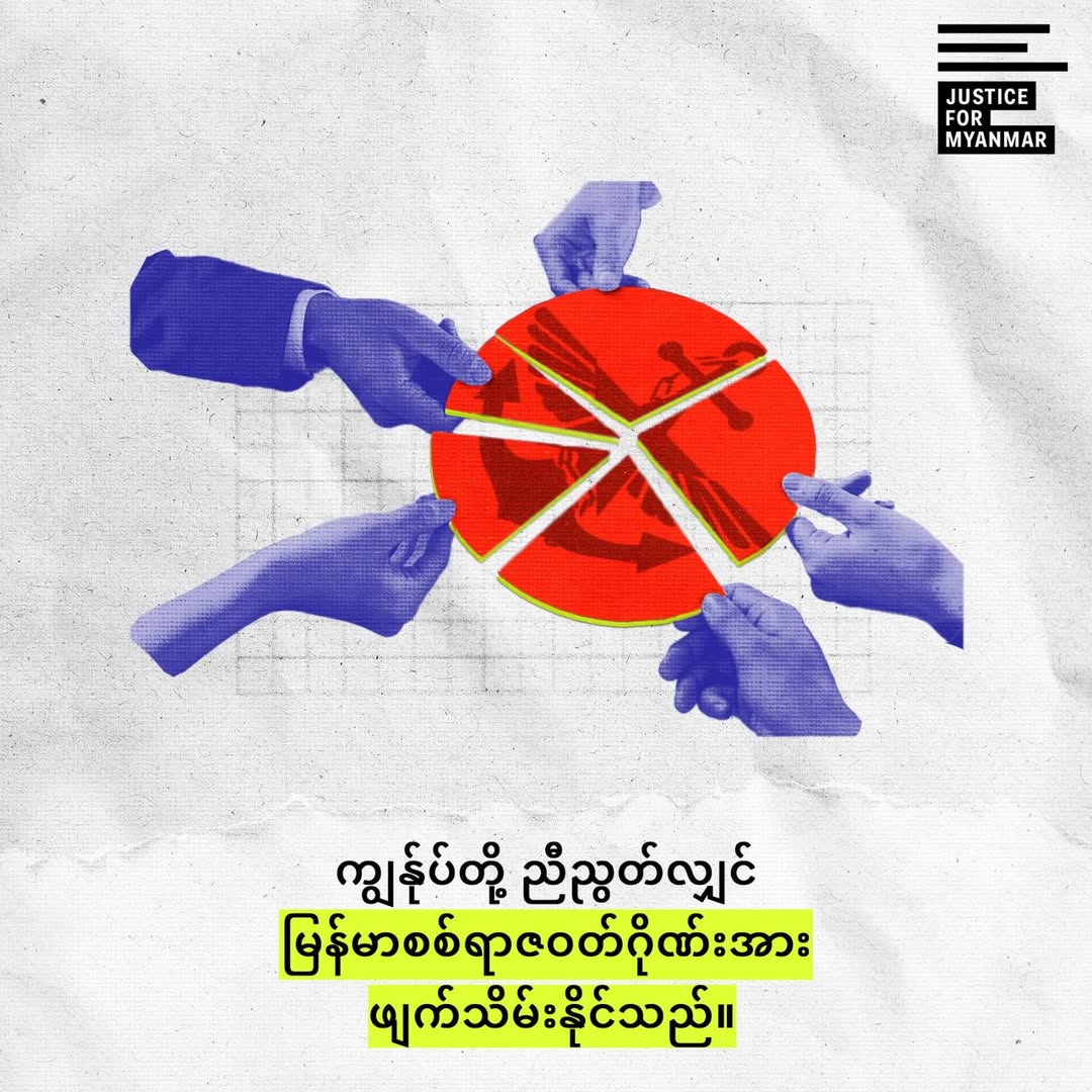 “ကျွန်ုပ်တို့ ညီညွတ်လျှင် မြန်မာစစ်ရာဇဝတ်ဂိုဏ်းအား ဖျက်သိမ်းနိုင်တယ်” လို့ မကြာသေးခင်က Right Livelihood Award (မှန်ကန်သောအသက်မွေးဝမ်းကြောင်းဆု) ရရှိထားတဲ့ Justice For Myanmar က ထုတ်ပြန်ပါတယ်။