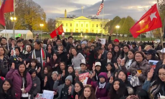 အမေရိကန်နိုင်ငံ အိမ်ဖြူတော်ရှေ့မှာ နိုဝင်ဘာ ၂၂ ရက် မနေ့ကက အကြမ်းဖက်စစ်တပ်ရဲ့ အတုအယောင်ရွေးကောက်ပွဲကို ဆန့်ကျင်ကြောင်း အမေရိကန်ရောက် မြန်မာနိုင်ငံသားတွေက ဆန္ဒပြခဲ့ကြပါတယ်။