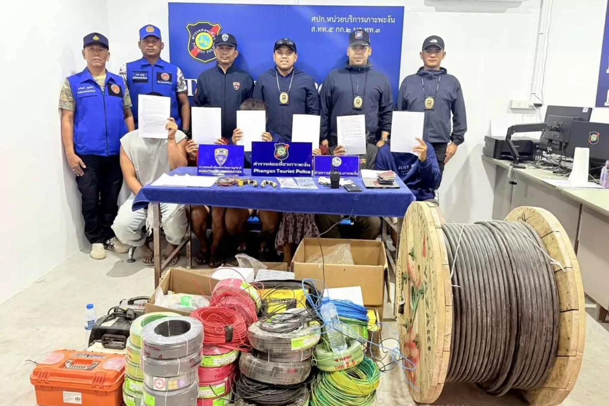 ဆူရတ်ထာနီ၊ Koh Phangan မှာ ကမ္ဘာလှည့်ခရီးသားရဲတပ်ဖွဲ့ဝင်များက ဖမ်းမိသည့် သံသယရှိသူ မြန်မာနိုင်ငံသားများနှင့် လျှပ်စစ်ဝါယာကြိုးများကို အတူတကွ ဓာတ်ပုံရိုက် မှတ်တမ်းတင်ခဲ့ကြသည်။ (ဓာတ်ပုံ ရဲတပ်ဖွဲ့)