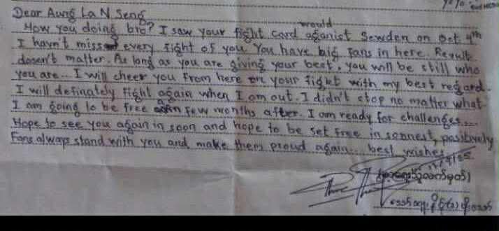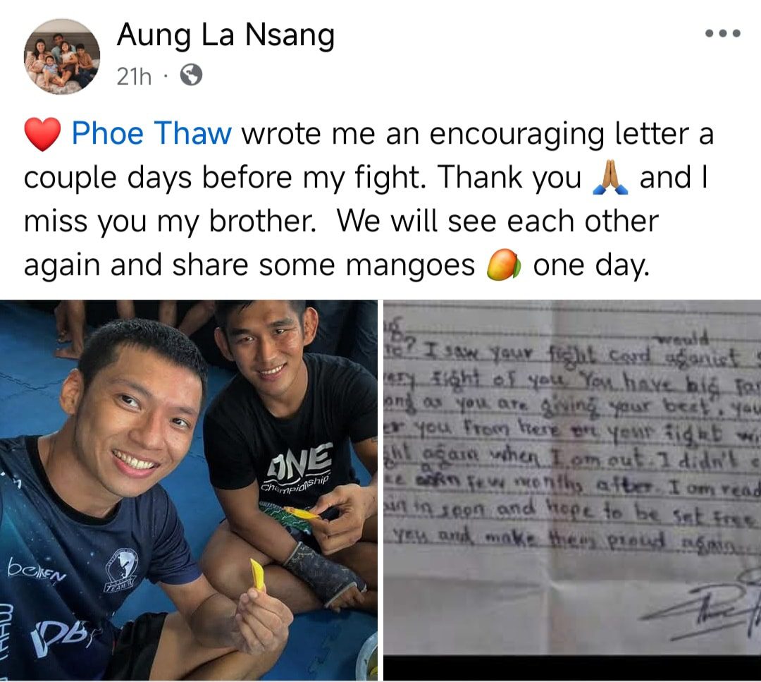 အကြမ်းဖက်စစ်တပ်က မတရားဖမ်းဆီး အကျဥ်းချထားတဲ့ MMA ဖိုက်တာ ဖိုးသော်က အကျဉ်းထောင်ထဲကနေ ပေးပို့လိုက်တဲ့စာကို One Championship ရဲ့ Hall of Fame ဖြစ်လာမယ့် MMA ကစားသမား အောင်လအန်ဆန်းက သူ့ရဲ့ Facebookစာမျက်နာမှာ အသိပေးဖော်ပြထားပါတယ်။