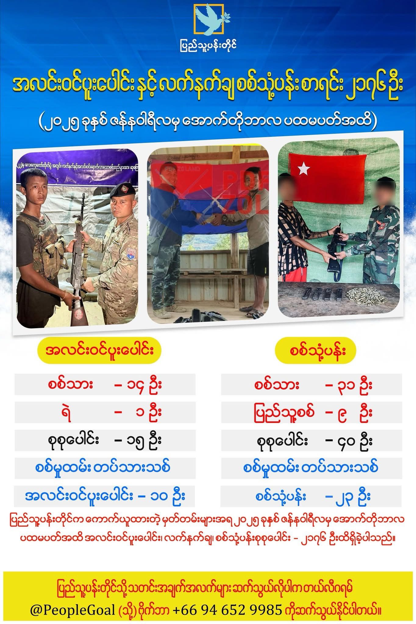 ၂၀၂၅ ခုနှစ် ဇန်နဝါရီလကနေ အောက်တိုဘာလ ပထမပတ်အထိ အကြမ်းဖက်စစ်အုပ်စုကနေ အလင်းဝင်ပူးပေါင်းသူနဲ့ လက်နက်ချ၊ စစ်သုံ့ပန်း စုစုပေါင်း ၂၁၇၆ ယောက်ထိ ရှိပြီဖြစ်တယ်လို့ ပြည်သူ့ပန်းတိုင်က ထုတ်ပြန်ထားပါတယ်။
