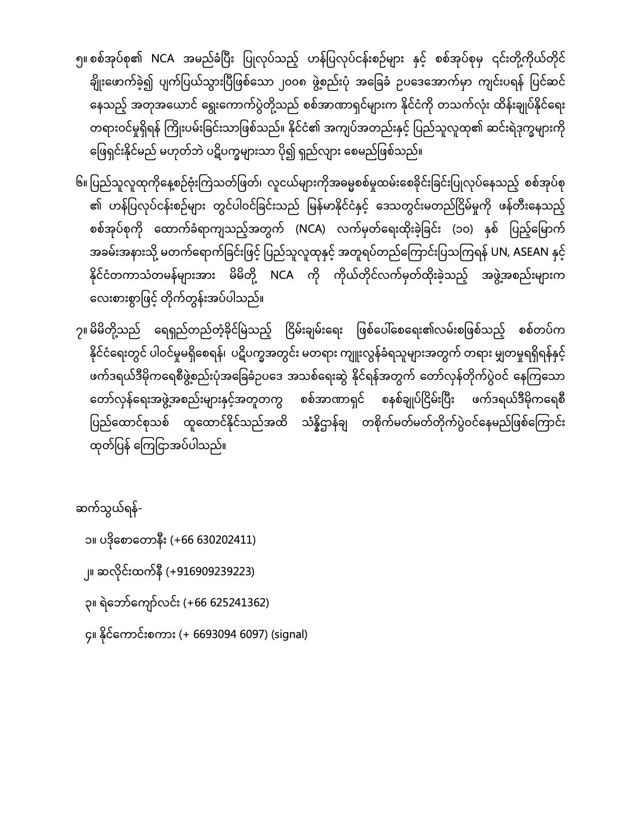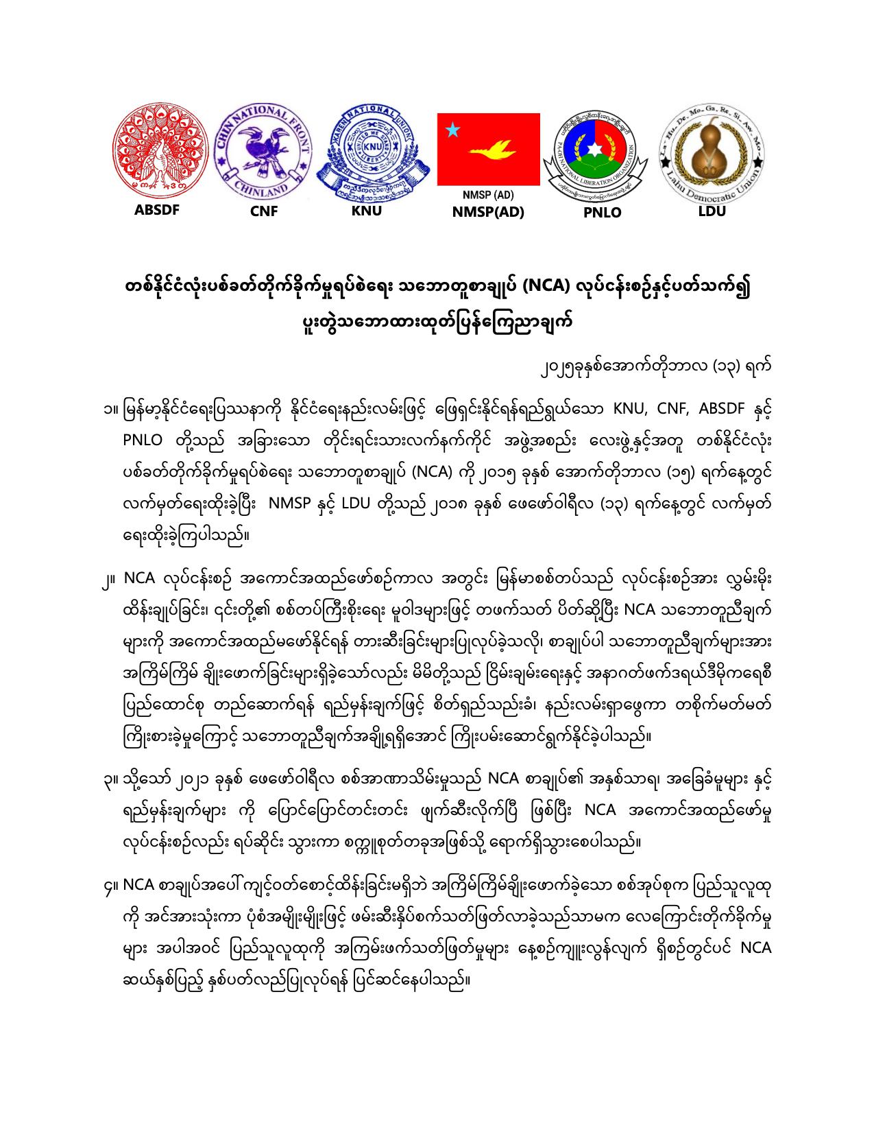 စစ်တပ်က ကျင်းပဖို့ ပြင်ဆင်နေတဲ့ တစ်နိုင်ငံလုံးပစ်ခတ် တိုက်ခိုက်မှုရပ်စဲရေး သဘောတူစာချုပ် (NCA) ရဲ့ (၁၀) နှစ်ပြည့် အခမ်းအနားကို မတက်ရောက်ကြဖို့နဲ့ NCA ဟာ စက္ကူစုတ်သာဖြစ်တယ်လို့ တော်လှန်ရေးအဖွဲ့အစည်း ၆ခုက အောက်တိုဘာ ၁၃ရက်မှာ ပူးတွဲ သဘောထားထုတ်ပြန်လာပါတယ်။