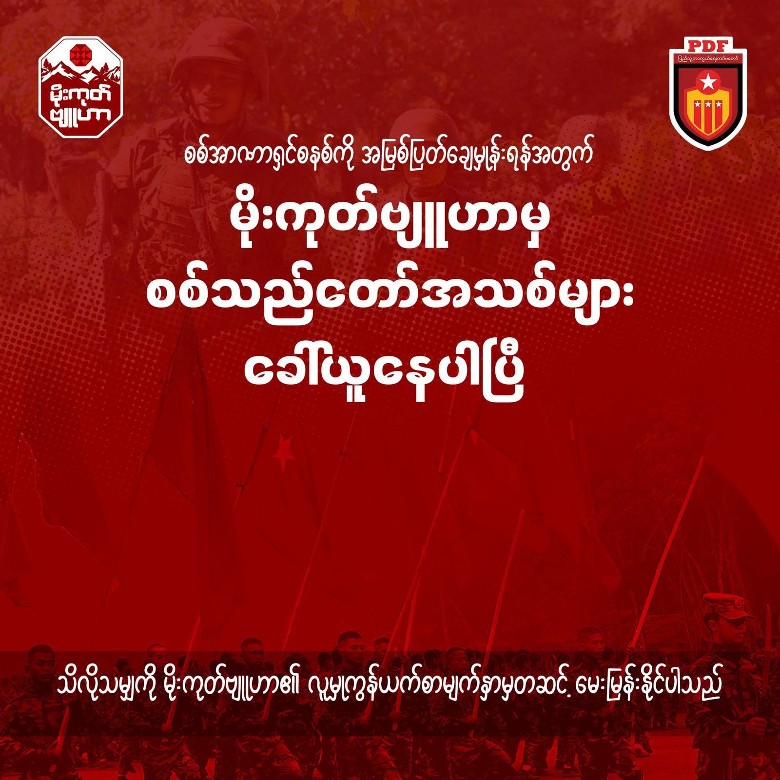 အမျိုးသားညီညွတ်ရေးအစိုးရ NUG ၊ ကာကွယ်ရေးဝန်ကြီးဌာနအောက်ရှိ မိုးကုတ်ဗျူဟာက တပ်သားသစ်တွေ ခေါ်ယူနေကြောင်း ကြေညာထားပါတယ်။