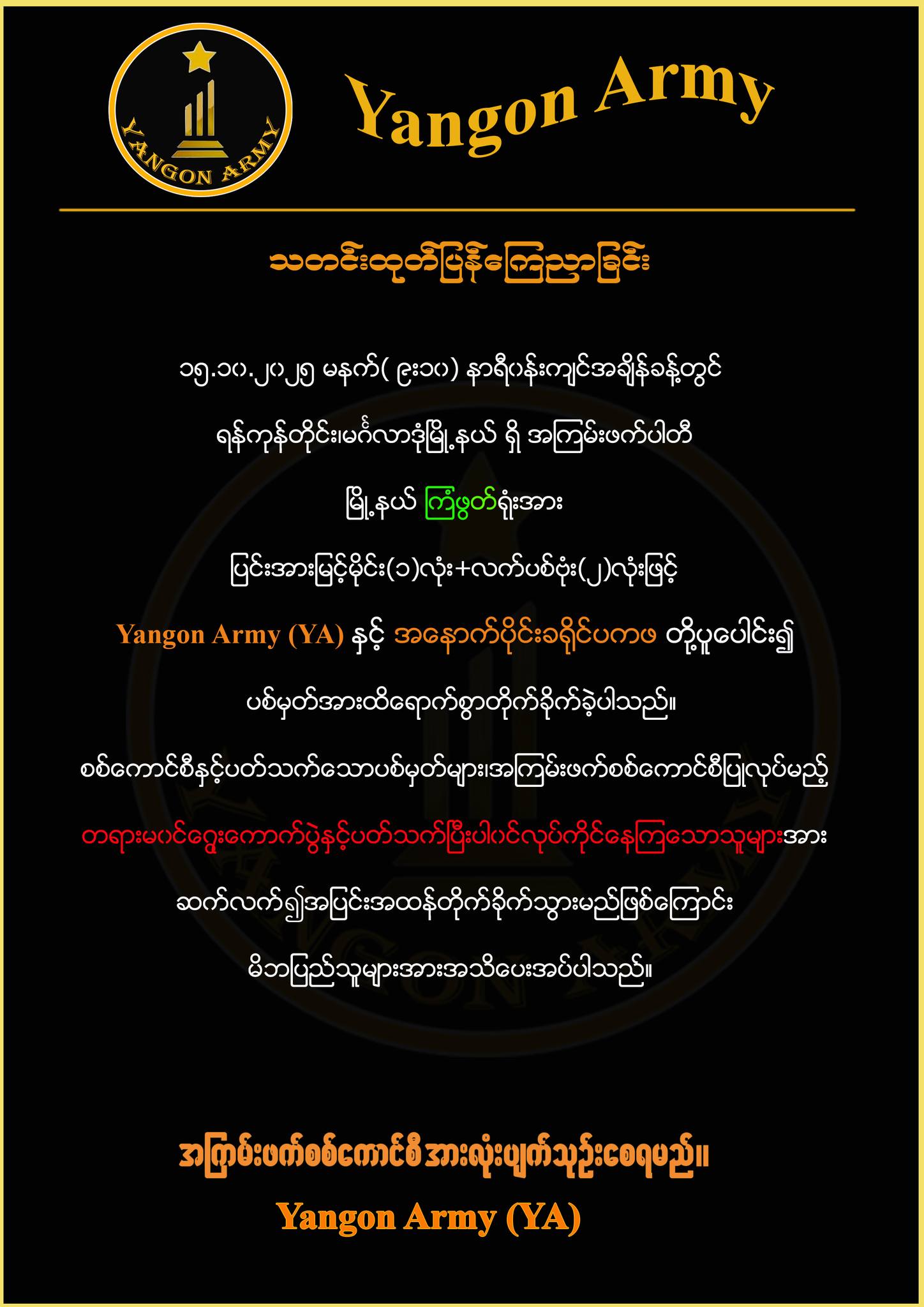 Yangon Army (YA) အပါအဝင် မြို့ပြပြောက်ကျားတပ်ဖွဲ့ဝင်တွေက အကြမ်းဖက်တစစ်တပ်ရဲ့ အတုအယာင်ရွေးကောက်ပွဲမှာ ပါဝင်ပတ်သက် လုပ်ကိုင်ကြမယ့်သူတွေကို ပစ်မှတ်ထား တိုက်ခိုက်သွားမယ်လို့လည်း ကြေညာထားကြပါတယ်။