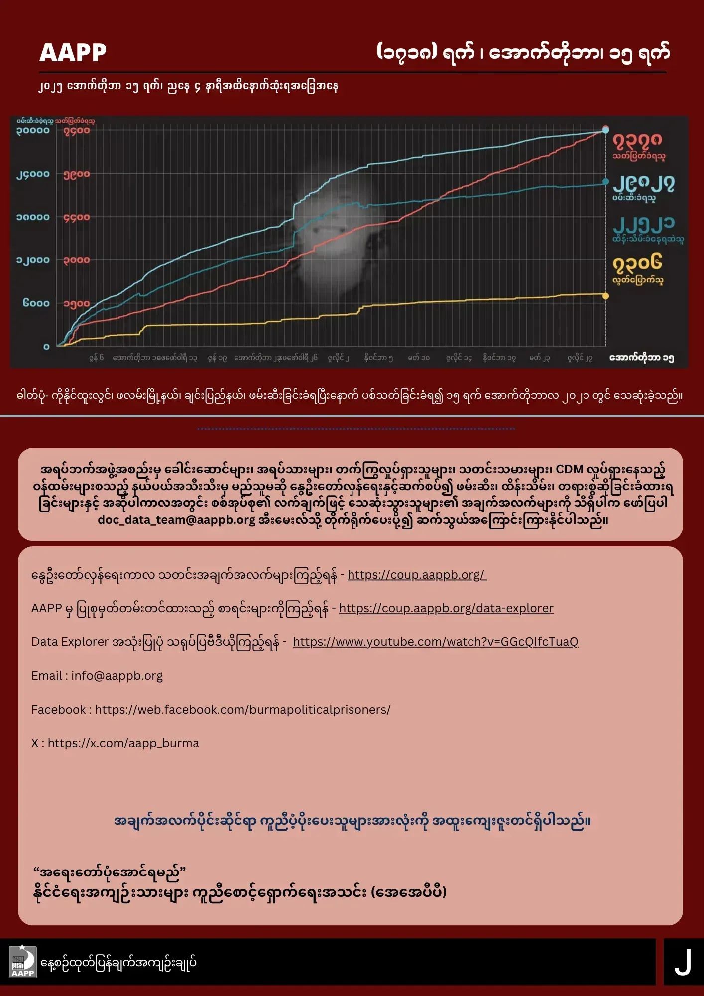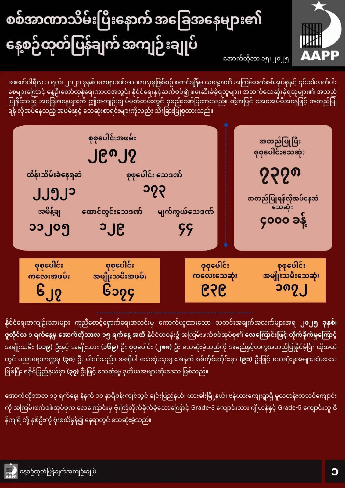 အဆိုပါ အချက်အလက်တွေဟာ AAPP အနေနဲ့ လက်လှမ်းမီသလောက် ကောက်ယူထားတာဖြစ်ပြီး တကယ့်မြေပြင်မှာဖြစ်ပွားနေတဲ့ အချက်အလက်တွေဟာ ဒီထက်ပိုမိုများပြားနိုင်တယ်လို့လည်း ဆိုပါတယ်။