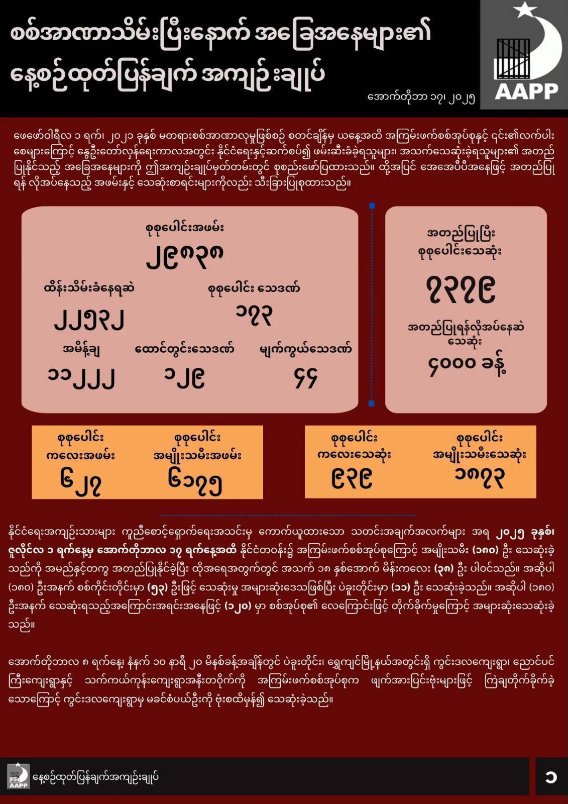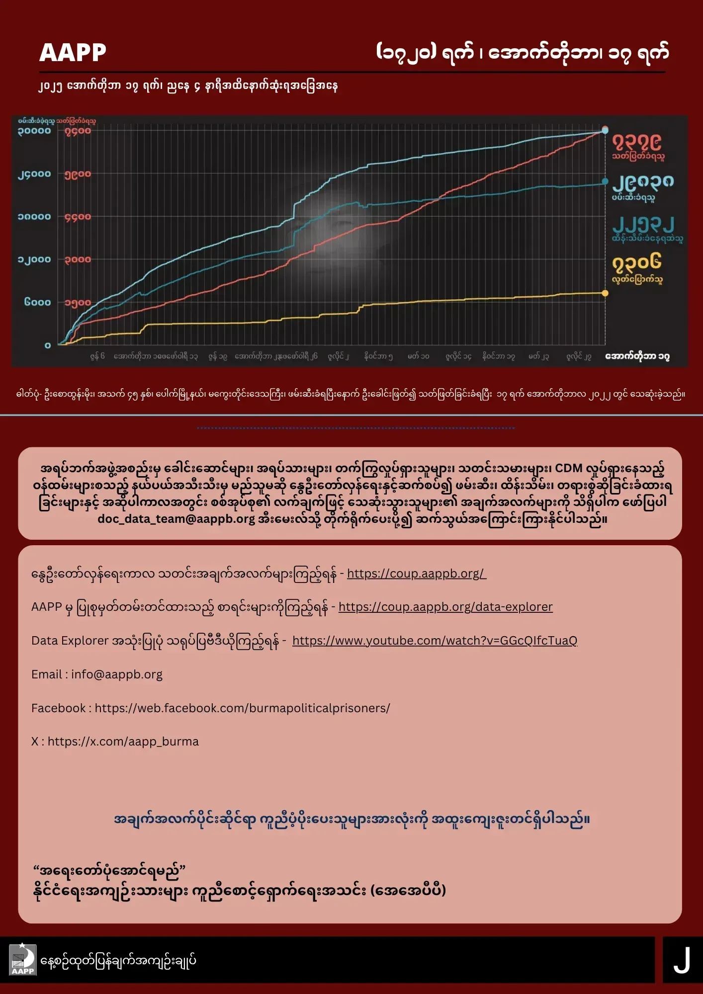 အကြမ်းဖက်စစ်အုပ်စုရဲ့ မတရားအာဏာလုချိန် ၂၀၂၁ ခုနှစ်၊ ဖေဖော်ဝါရီ ၁ ရက် ကနေ ၂၀၂၅ ခုနှစ် အောက်တိုဘာ ၁၇ ရက်အထိ နွေဦးတော်လှန်ရေးကာလအတွင်း အကြမ်းဖက်စစ်အုပ်စုနဲ့ လက်ပါးစေတွေကြောင့် သေဆုံးခဲ့ရသူ ဒီမိုကရေစီအရေး လှုပ်ရှားသူ နဲ့ ပြည်သူ စုစုပေါင်း ၇၃၇၉ ယောက် ရှိပြီဖြစ်တယ်လို့ AAPP က ထုတ်ပြန်ထားပါတယ်။
