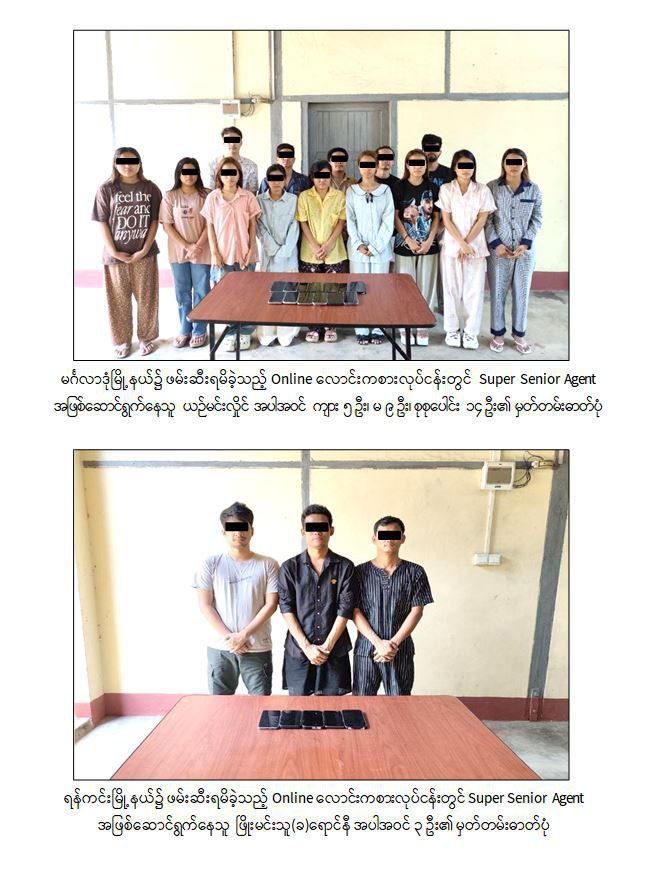 ရန်ကုန်ကနေ ဖမ်းဆီးရမိသူတွေဟာ ၁၄ယောက် ဖြစ်ပြီး ပြီးခဲ့တဲ့ အောက်တိုဘာလ ၁၄ ရက်နေ့မှာ ဖမ်းဆီးခဲ့ကာ ဆက်စပ်ပစ္စည်းတွေကိုလည်း သိမ်းဆည်းရမိခဲ့တယ်လို့ ဆိုပါတယ်။ သိမ်းဆည်းရမိတဲ့ ပစ္စည်းတွေကတော့ ဖုန်း(၂၃)လုံးနဲ့ ကား(၃)စီးတို့ ဖြစ်ပြီး အောက်တိုဘာလ ၁၅ ရက်နေ့မှာလည်း လူ ၃ယောက်နဲ့အတူ ဖုန်း (၅)လုံး၊ ကား (၃) စီးတို့ကို ထပ်မံဖမ်းဆီးရမိခဲ့တယ်လို့ ထုတ်ပြန်ထားပါတယ်။