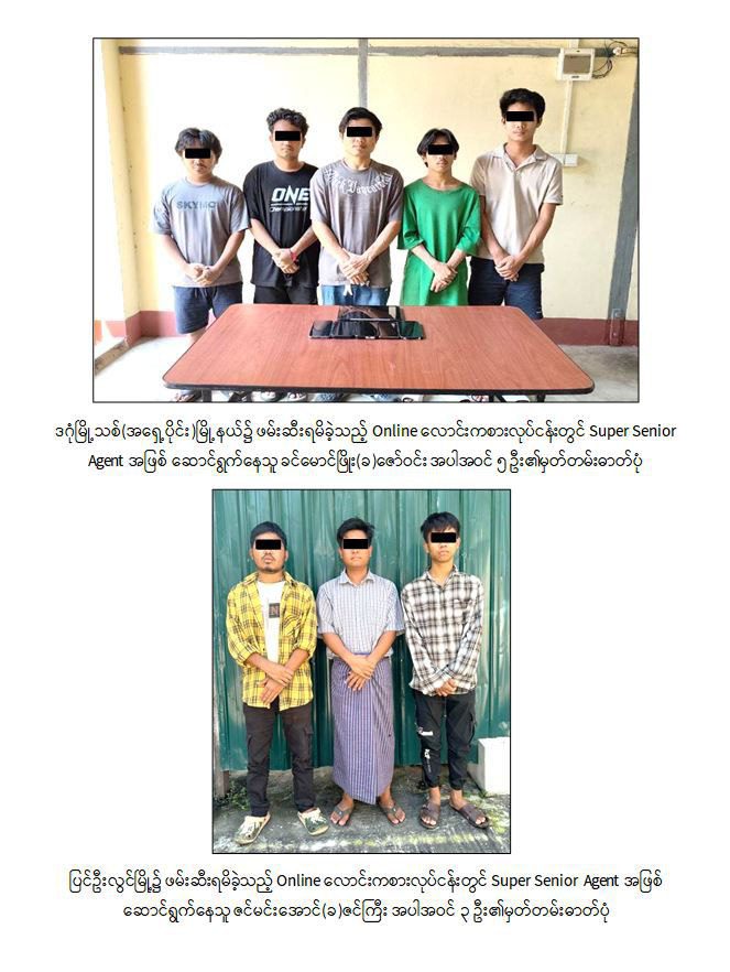 အလားတူ အောက်တိုဘာလ ၁၆ ရက်နေ့မှာ မန္တလေးတိုင်း၊ ပြင်ဦးလွင်မြို့က လောင်းကစားလုပ်ငန်းလုပ်ကိုင်သူ ၃ယောက်ကို ဖုန်း(၇)လုံး၊ လက်တော့ပ်(၁)လုံး၊ ကား(၁)စီးနဲ့အတူ ဖမ်းဆီးကာ မဟာအောင်မြေမြို့နယ်က ၂ယောက်ကိုလည်း ဖုန်း(၅)လုံး၊ လက်တော့ပ်(၁)လုံး၊ ကား(၁)စီးနဲ့ ဖမ်းဆီးခဲ့တယ်လို့ သိရပါတယ်။