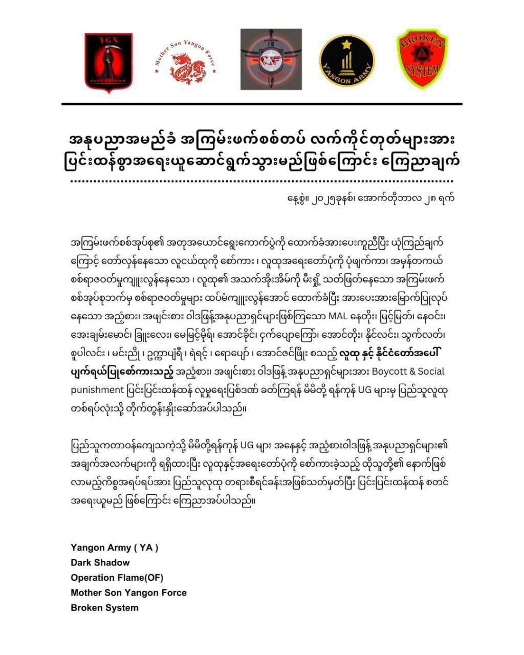 ဒီထုတ်ပြန်ချက်ကို ရန်ကုန် UG အဖွဲ့တွေဖြစ်တဲ့ Yangon Army (YA) ၊ Dark Shadow ၊ Operation Flame (OF) ၊ Mother Son Yangon Force နဲ့ Broken System အဖွဲ့တွေ ပူးတွဲ ထုတ်ပြန်လိုက်တာ ဖြစ်ပါတယ်။