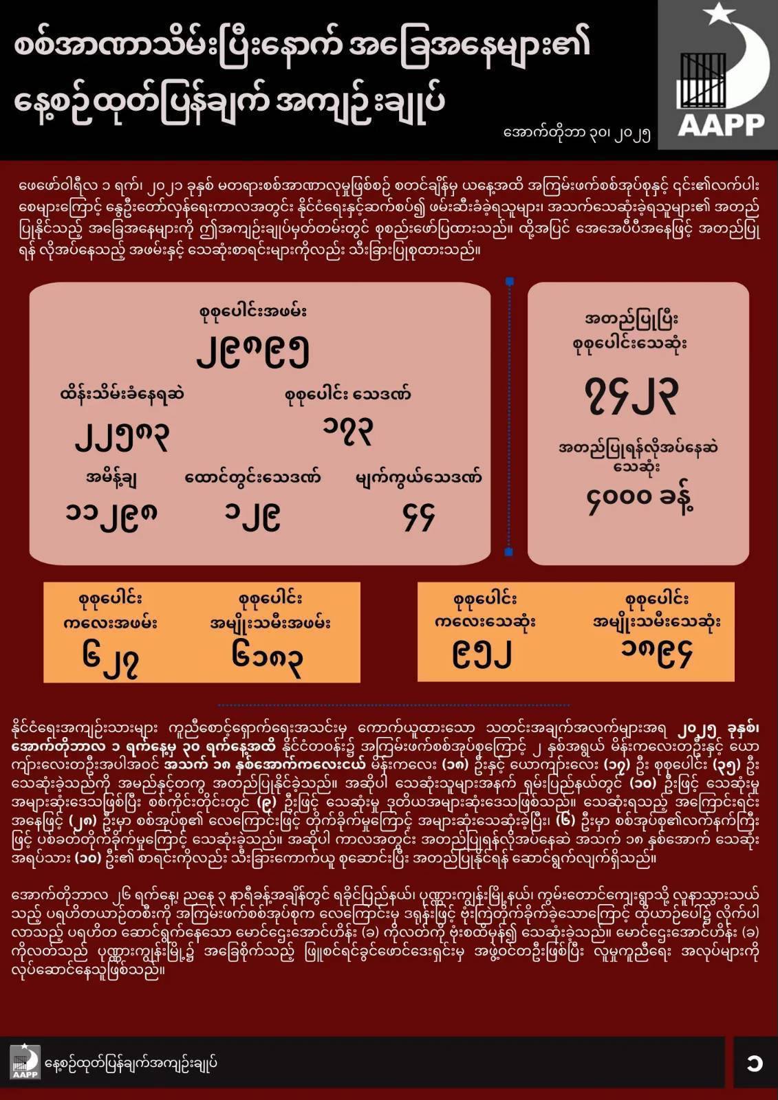 ၂၀၂၁ ခုနှစ် ဖေဖော်ဝါရီ ၁ရက် မတရားစစ်အာဏာသိမ်းမှု စတင်ချိန်ကနေ ၂၀၂၅ ခုနှစ် အောက်တိုဘာ ၃၀ ရက်နေ့အထိ အကြမ်းဖက်စစ်အုပ်စုနဲ့ လက်ပါးစေတွေကြောင့် ဒီမိုကရေစီအရေး လှုပ်ရှားသူတွေနဲ့ ပြည်သူ စုစုပေါင်း ၇၄၂၃ ယောက် သေဆုံးခဲ့ရတယ်လို့ AAPP ရဲ့ ထုတ်ပြန်ချက်မှာ ဖော်ပြထားပါတယ်။