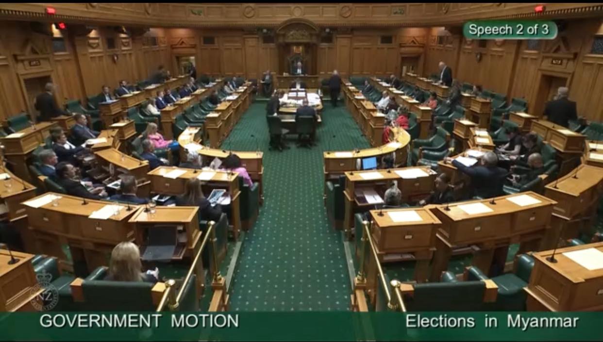 နယူးဇီလန်ပါလီမန်က မြန်မာစစ်အုပ်စု ကျင်းပဖို့ စီစဉ်နေတဲ့ ရွေးကောက်ပွဲကို လက်မခံကြောင်းနဲ့ ရွေးကောက်ပွဲဟာ တရားမျှတမှာ မဟုတ်ကြောင်း ကန့်ကွက်သူမရှိဘဲ တညီတညွတ်တည်း အတည်ပြုခဲ့တယ်လို့ သိရပါတယ်။