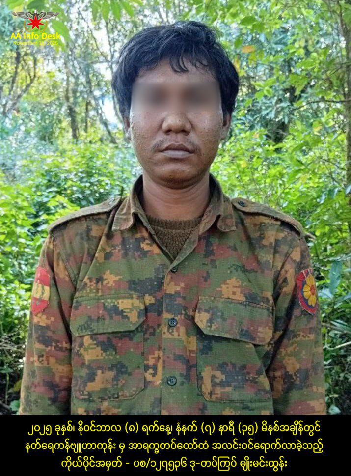 ရခိုင့်တပ်တော် AA နဲ့ အာဏာသိမ်းစစ်တပ်တို့ ရခိုင်-ပဲခူးတိုင်းအစပ်၊ ရခိုင်-မကွေးတိုင်းအစပ်၊ ရခိုင်-ဧရာဝတီတိုင်းအစပ်တို့မှာ တိုက်ပွဲတွေ ပြင်းထန်နေပြီး အဆိုပါတိုက်ပွဲတွေကနေ အလံဖြူထောင် လက်နက်ချတဲ့ စစ်သားတွေ၊ ကစဥ့်ကလျား ထွက်ပြေးလာတဲ့ စစ်သားတွေကို ဆက်တိုက်ဖမ်းဆီးရမိနေတယ်လို့ AA က ဆိုပါတယ်။