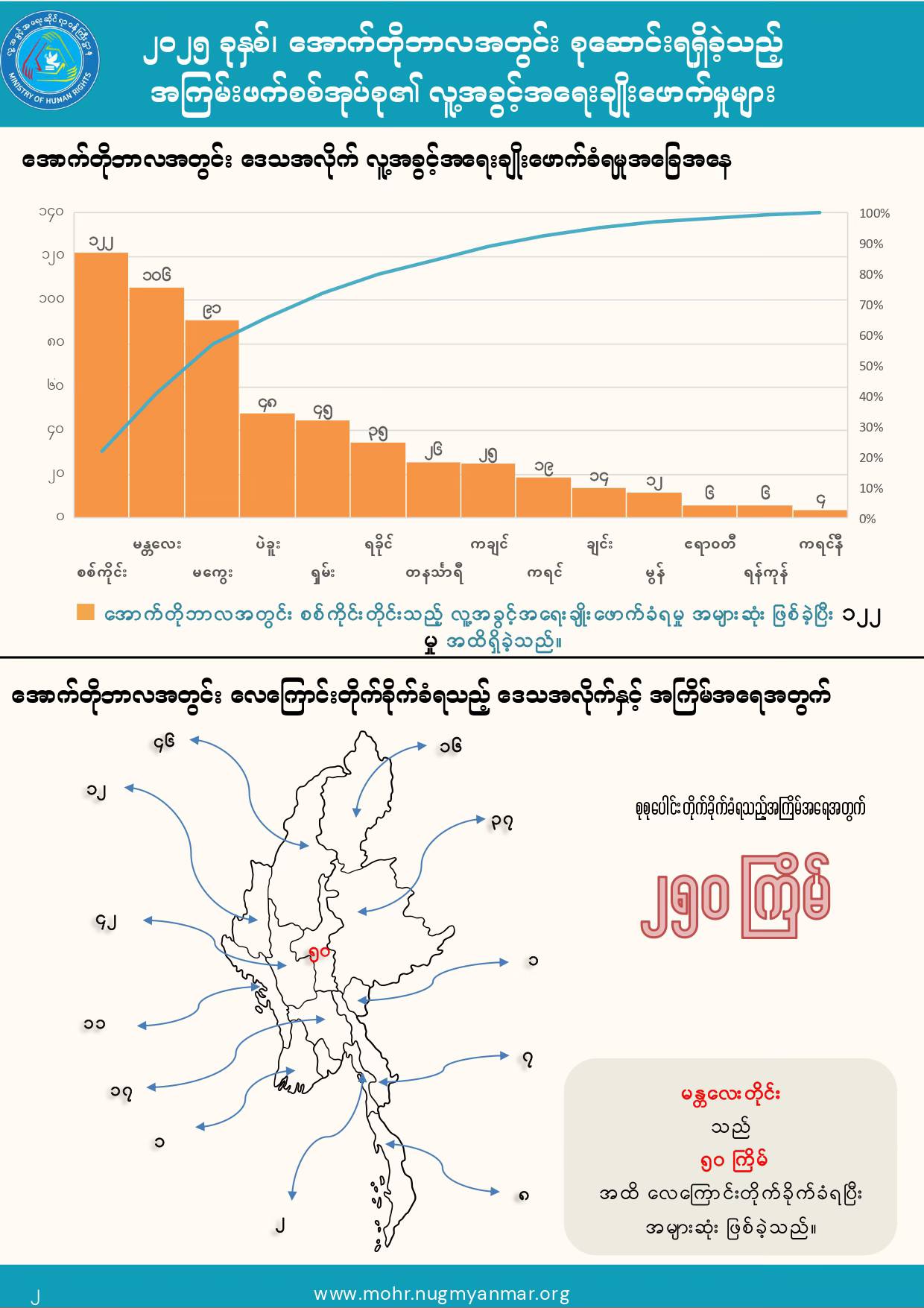 တစ်လအတွင်း လူ့အခွင့်အရေးချိုးဖောက်မှုပေါင်း ၅၅၉ မှုကို စစ်တပ်က ပုံစံမျိုးစုံနဲ့ ကျူးလွန်ခဲ့ပြီး ဒီလိုလုပ်ရပ်တွေအပေါ် နိုင်ငံတကာက အရေးယူနိုင်ဖို့၊ ကျူးလွန်ခံရသူတွေရဲ့ နစ်နာမှုအတွက် တရားမျှတမှုရရှိစေဖို့ သက်သေအထောက်အထား အပြည့်အစုံနဲ့ စုဆောင်းထားတယ်လို့ NUG လူ့အခွင့်အရေးဝန်ကြီးဌာနက ထုတ်ပြန်ပါတယ်။