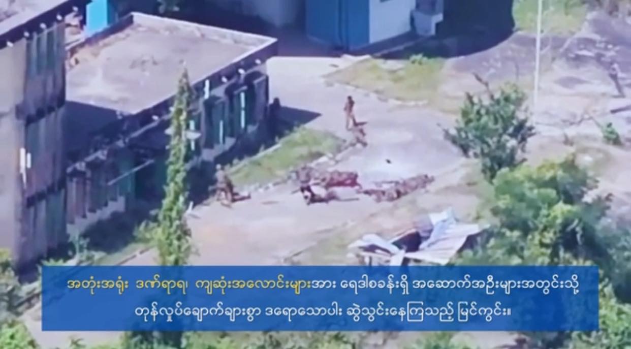 ဓာတ်ပုံရိုက်နေတဲ့ စစ်အုပ်စု လက်နက်ကြီးပစ်ခံရပြီးတဲ့နောက် စစ်သားတချို့ ဒဏ်ရာရကာ ထော့ကျိုး ထွက်ပြေးခဲ့ကြသလို စစ်သားအလောင်း ၈ လောင်းခန့်ကို အဆောက်အအုံထဲ ဆွဲယူသွားတာလည်း တွေ့မြင်ရပါတယ်။
