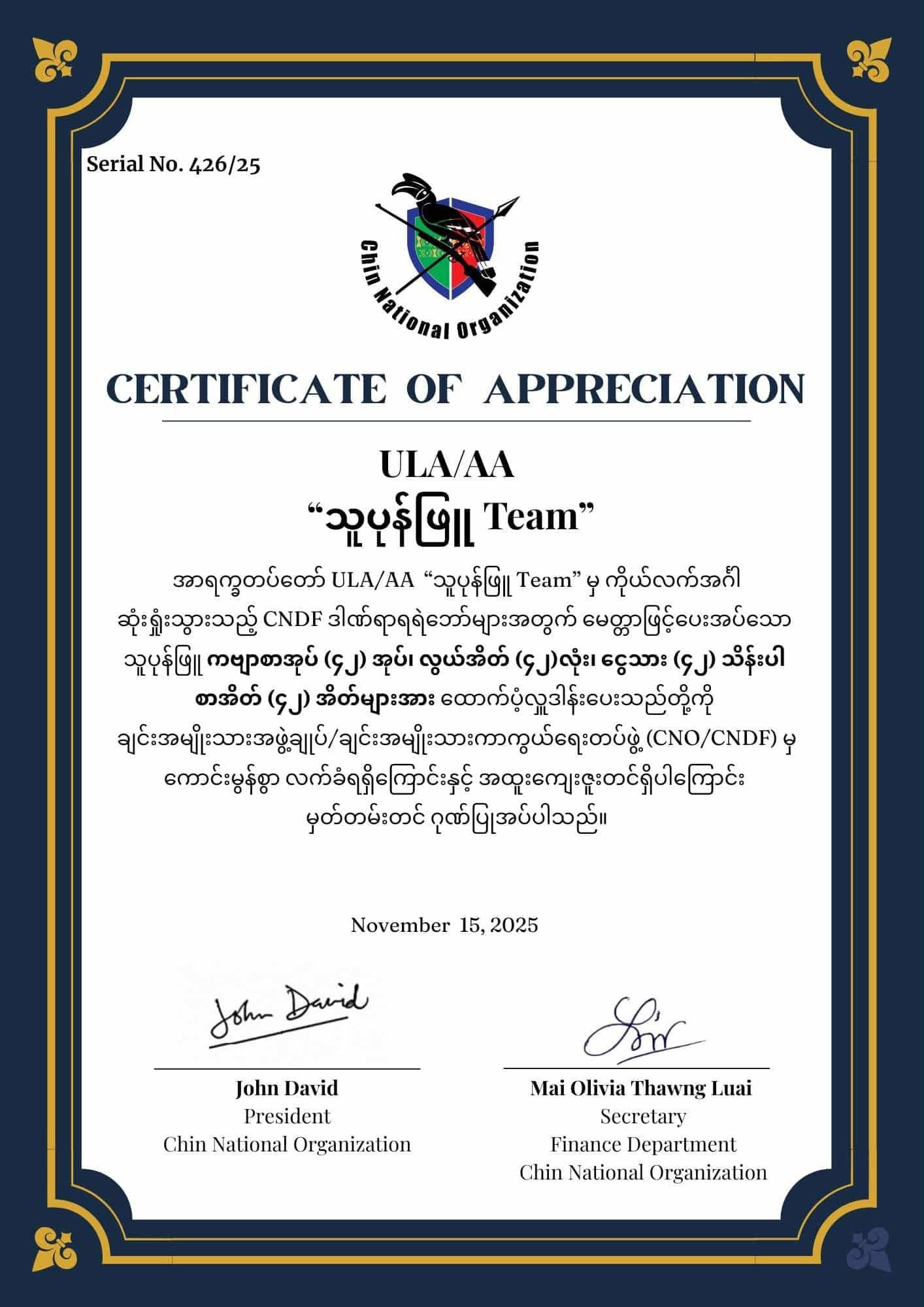 အာရက္ခတပ်တော် သူပုန်ဖြူအဖွဲ့က ချင်းအမျိုးသားအဖွဲ့ချုပ်/ ချင်းအမျိုးသား ကာကွယ်ရေးတပ်ဖွဲ့ (CNO/CNDF) ရဲ့ ကိုယ်လက်အင်္ဂါဆုံးရှုံးသွားတဲ့ ရဲဘော်တွေအတွက် အခုလို ထောက်ပံ့လှူဒါန်းခဲ့တာဖြစ်ပြီး CNO/CNDF အနေနဲ့ ကောင်းမွန်စွာလက်ခံရရှိကာ အထူးကျေးဇူးတင်မှတ်တမ်းတင်တယ်လို့ CNO/CNDF က ထုတ်ပြန်ပါတယ်။