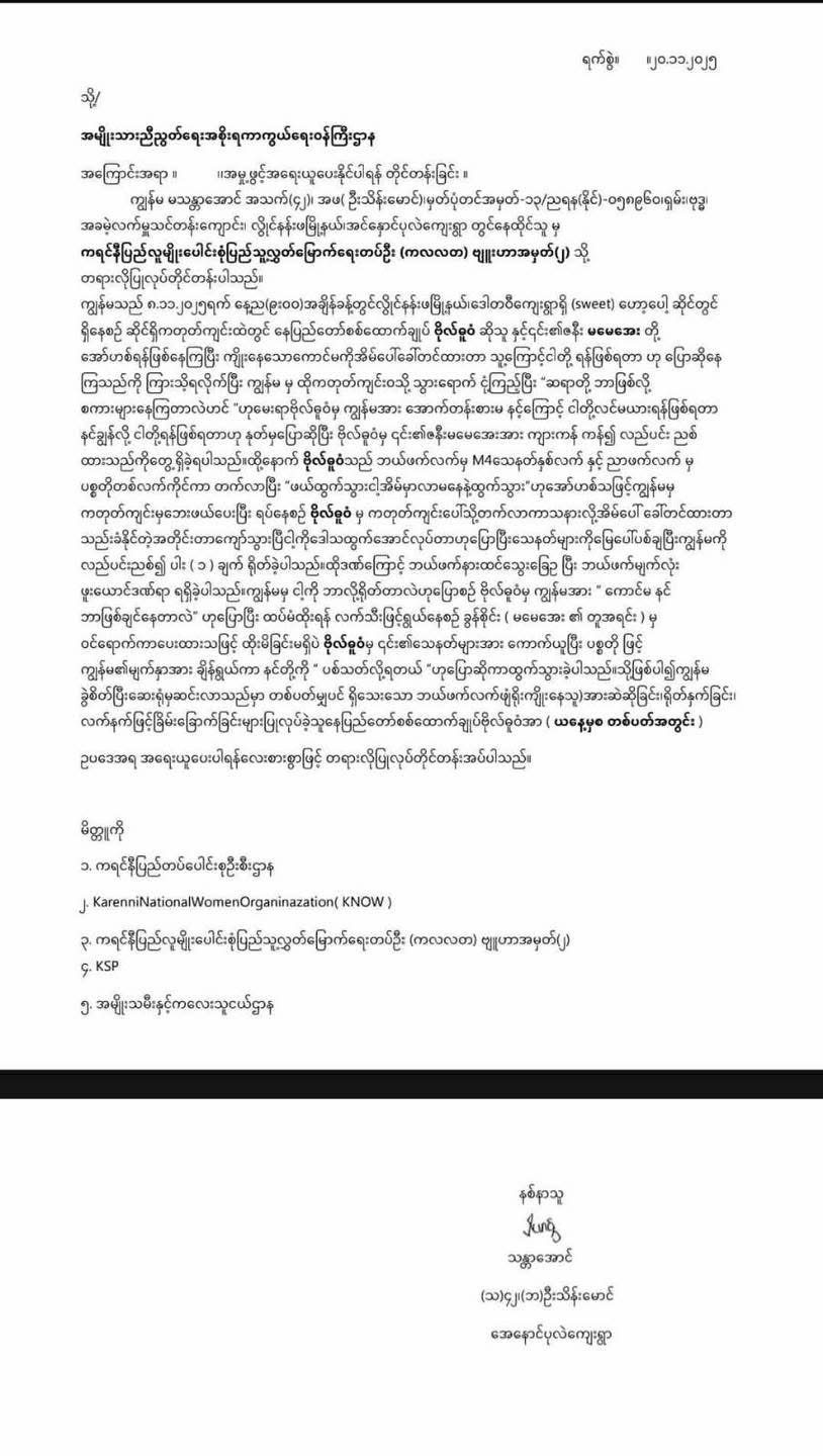 မသန္တာအောင်က သူ့အပေါ် ကိုယ်ထိလက်ရောက်ကျူးလွန်ခဲ့မှုနဲ့ ဗိုလ်ဓူဝံကို NUG ကာကွယ်ရေးဝန်ကြီးဌာန အပါအဝင် ကရင်နီပြည်လူမျိုးပေါင်းစုံ ပြည်သူ့လွတ်မြောက်ရေးတပ်ဦး (ကလလတ)၊ ကရင်နီပြည် ကြားကာလ အုပ်ချုပ်ရေးကောင်စီ (IEC) ၊ အမျိုးသမီးနှင့်ကလေးသူငယ်ဌာန၊ ကရင်နီပြည်ရဲဌာန (KSP) ၊ ကရင်နီပြည်တပ်ပေါင်းစုံ စစ်ဦးစီးအဖွဲ့ (JCS) နဲ့ ကရင်နီအမျိုးသမီးအစည်းအရုံး (KNWO) တို့ကို တိုင်ကြားထားကြောင်း သိရပါတယ်။