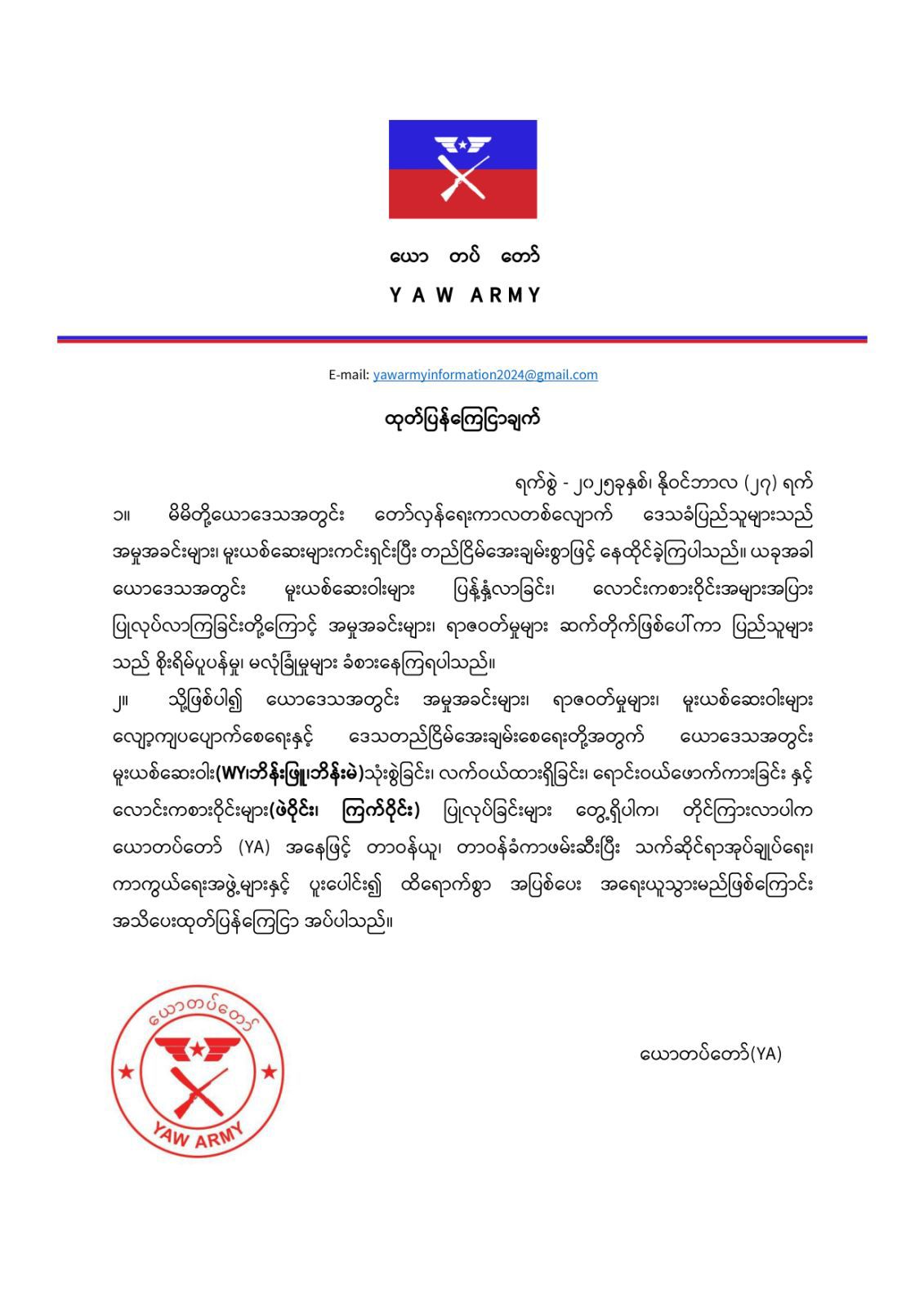 အဆိုပါ ထုတ်ပြန်ချက်အပေါ် Yaw Army (YA) ကို မောင်းသတင်းဌာနအနေနဲ့ ဆက်သွယ်မေးမြန်းထားဆဲ ဖြစ်ပါတယ်။