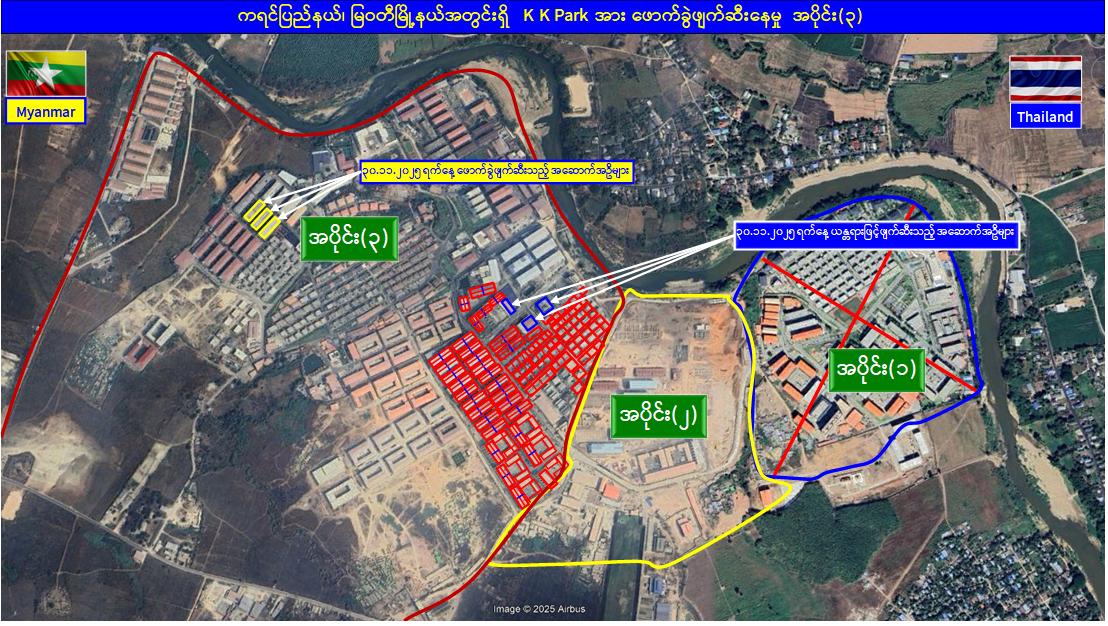 အကြမ်းဖက်စစ်တပ်က ထိုင်း-မြန်မာနယ်စပ်၊ မြဝတီ-မဲထော်သလေး KK Park အွန်လိုင်းငွေလိမ် (ကျားဖြန့်) လုပ်ငန်းနယ်မြေရှိ အဆောက်အအုံတွေကို ဖြိုချဖျက်ဆီးပစ်နေပေမယ့် ရွှေကုက္ကိုလ်နယ်မြေအတွင်းက အွန်လိုင်းငွေလိမ်လုပ်ငန်းမှာ အသုံးပြုခဲ့တဲ့ အဆောက်အအုံတွေကိုတော့ မဖျက်ဆီးဘဲ ချိတ်ပိတ်သိမ်းဆည်းတာတွေ လုပ်ဆောင်နေတယ်လို့ သိရပါတယ်။