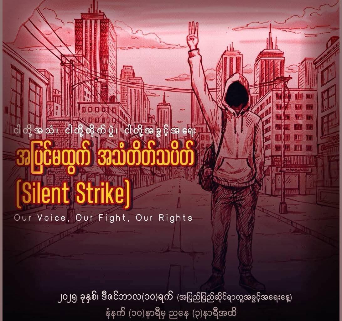 လာမယ့် ဒီဇင်ဘာလ ၁၀ ရက်နေ့ဟာ အပြည်ပြည်ဆိုင်ရာ လူ့အခွင့်အရေးနေ့ဖြစ်တာကြောင့် အဲဒီနေ့မှာ တစ်နိုင်ငံလုံးအတိုင်းအတာနဲ့ အပြင်မထွက်၊ အသံတိတ်သပိတ် ပြုလုပ်မယ်လို့ အထွေထွေသပိတ် ပေါင်းစပ်ညှိနှိုင်းရေးအင်အားစု (GSCB) ထုတ်ပြန်တိုက်တွန်းလိုက်ပါတယ်။