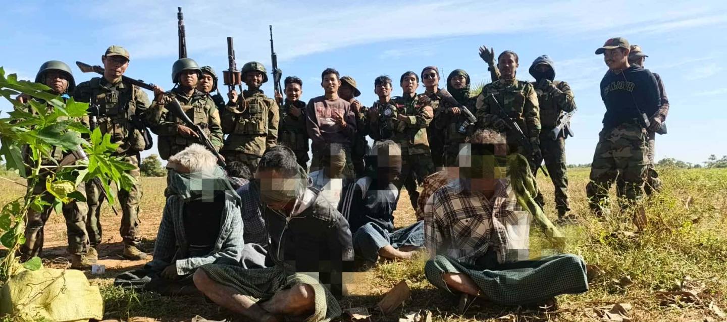 ပုံစာ – ဖမ်းဆီးရမိသည့် ငွေတွင်းရွာ ပျူစောထီးများအား တော်လှန်ရေးတပ်များနှင့်အတူ တွေ့ရစဥ်