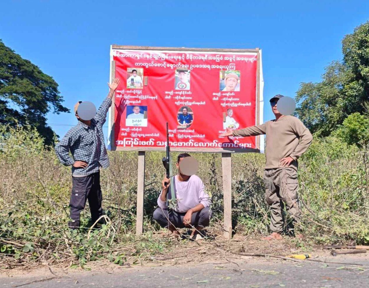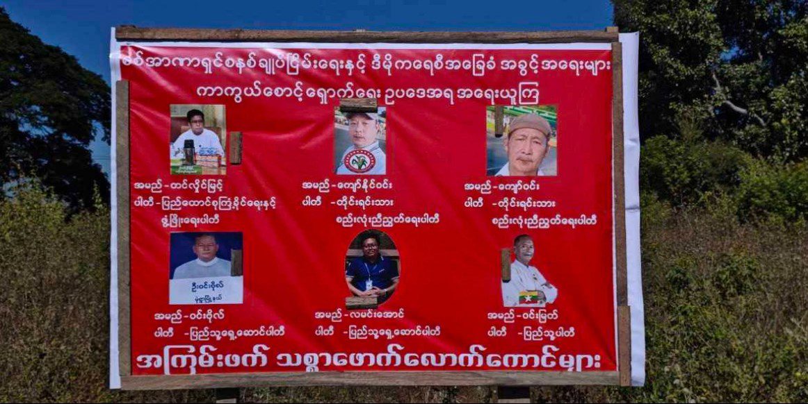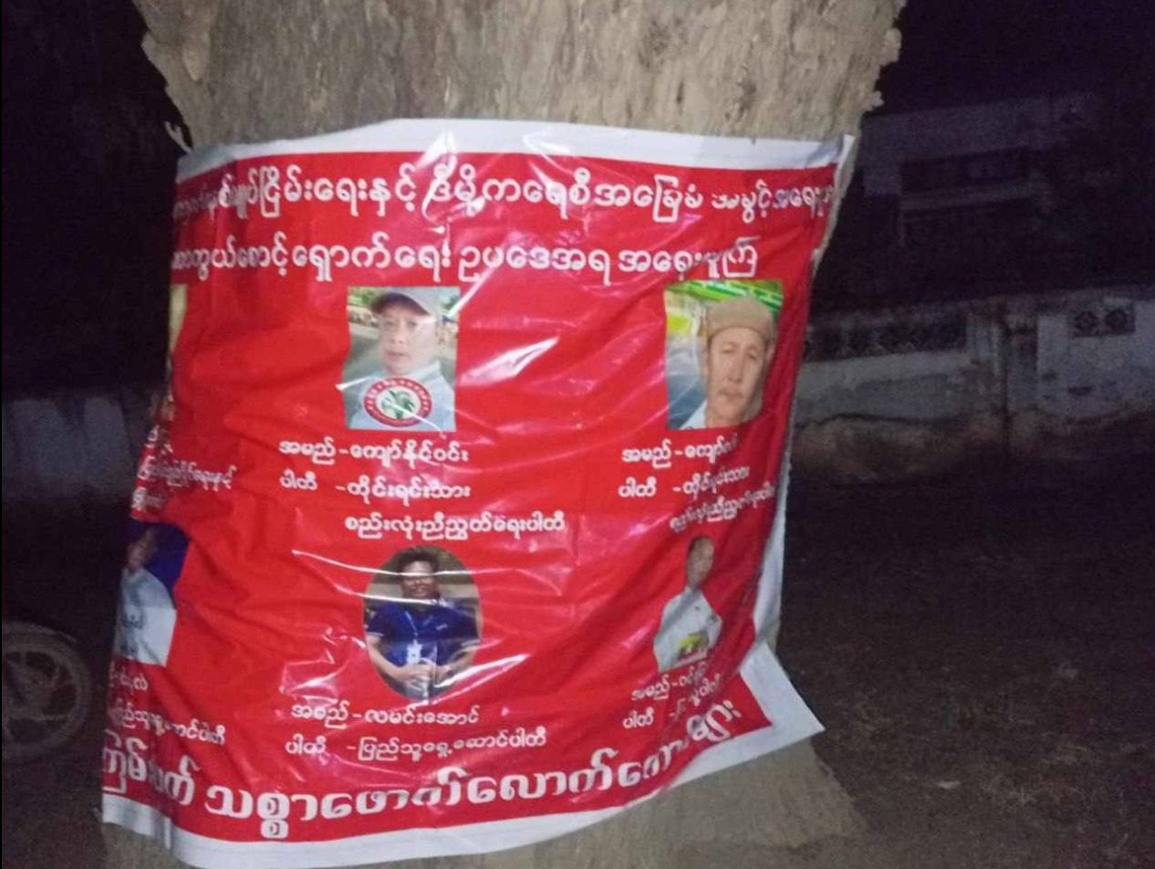 အကြမ်းဖက်စစ်အုပ်စုရဲ့ ရွေးကောက်ပွဲမှာ ဝင်ရောက်အရွေးခံမယ့်သူများကို အရေးယူမှာဖြစ်ကြောင်း နဲ့ ပြည်သူလူထုအနေနဲ့လည်း ၎င်းတို့ကို social punishment ပြုလုပ်နိုင်ဖို့ အသိပေးသည့်အနေနဲ့ မုံရွာမြို့နယ်အတွင်းရှိ နေရာတော်တော်များများမှာ နယ်မြေခံတော်လှန်ရေးအင်အားစုများက ဒီကနေ့ ဒီဇင်ဘာ ၁၄ ရက်မှာ Vinyl Billboard များထောင်ကာအသိပေးခဲ့တယ်လို့ သိရပါတယ်။