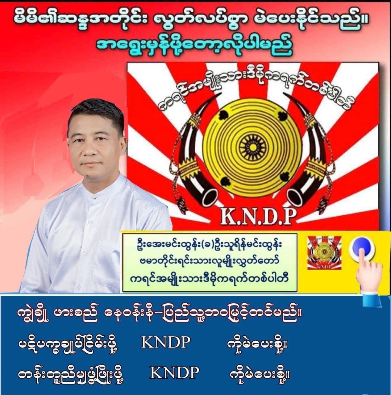 ကရင်ပြည်နယ်၊ မြဝတီမြို့က ပြည်သူတွေကို လက်နက်ပြ အနိုင်ကျင့်တာတွေ လုပ်လေ့ရှိတဲ့ ပျူစောထီးခေါင်းဆောင် အေးမင်းထွန်း (ခ) သူရိန်မင်းထွန်းဆိုသူဟာ ကရင်အမျိုးသား ဒီမိုကရက်တစ်ပါတီ (KNDP) အမတ်လောင်း၊ ဗမာတိုင်းရင်းသားကိုယ်စားလှယ်အဖြစ် စစ်အုပ်စု ကျင်းပသွားမယ့် ရွေးကောက်ပွဲမှာ ပါဝင်ယှဉ်ပြိုင်သွားမယ်လို့ သိရပါတယ်။