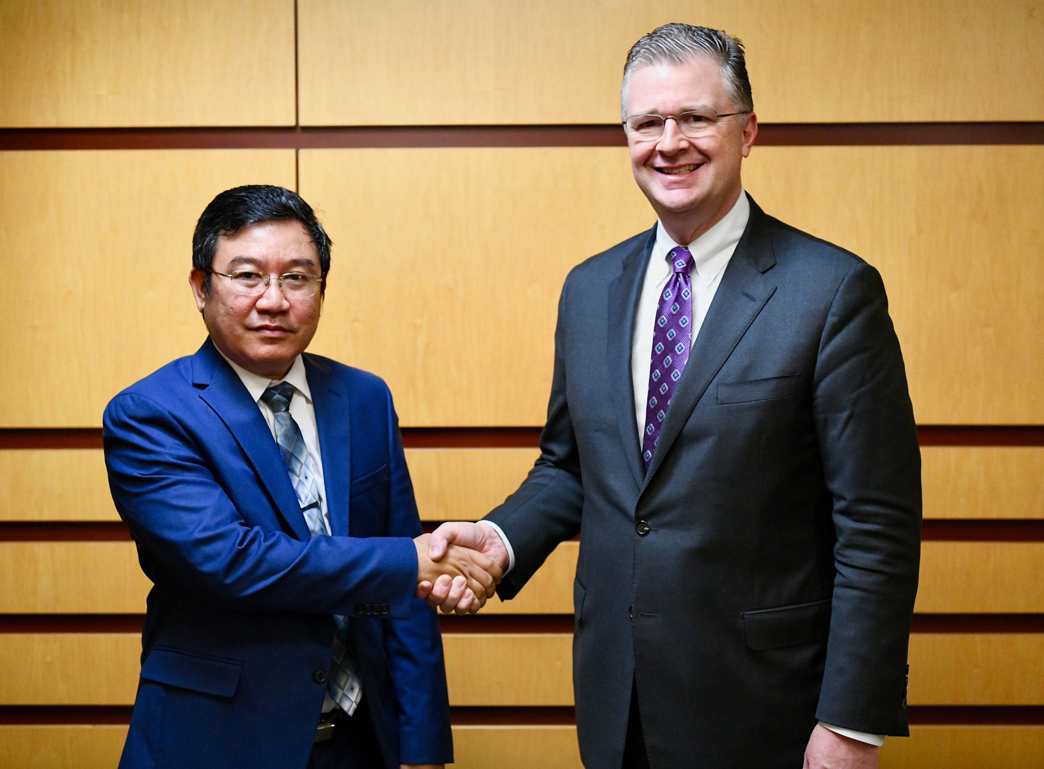 NUG နိုင်ငံခြားရေးဝန်ကြီးဌာန အကြံပေး ဦးမိုးဇော်ဦးနှင့် အမေရိကန် လက်ထောက်နိုင်ငံခြားရေးဝန်ကြီး Daniel J. Kritenbrink တို့ ၂၀၂၂ ခုနှစ်တွင် ဆုံခဲ့စဉ်  (ဓာတ်ပုံ US embassy Yangon)