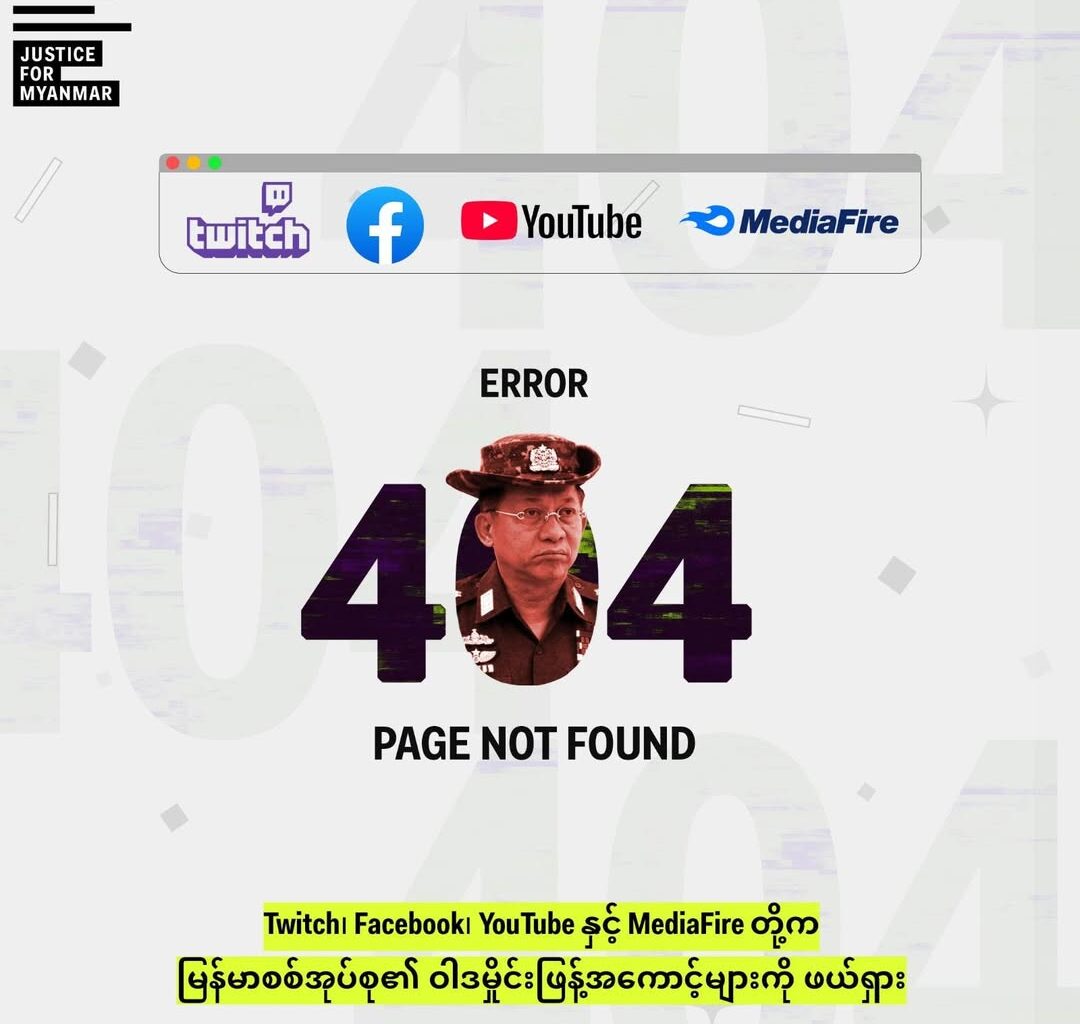 စစ်အုပ်စုရဲ့ ဝါဒဖြန့်ချိရေး မီဒီယာပလက်ဖောင်းတွေဖြစ်တဲ့ MRTV ၊ MITV နဲ့ Myanmar Radio လိုင်း ၁၄ ခုကို Twitch ၊ Facebook ၊ YouTube နဲ့ MediaFire တို့ကနေ ဖြုတ်ချလိုက်တာ ဖြစ်ပါတယ်။