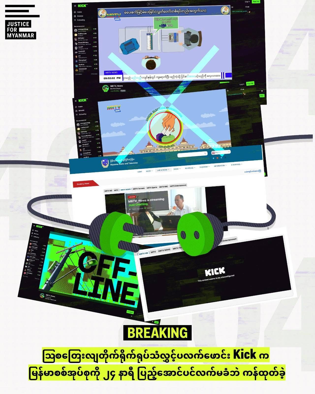 စစ်အုပ်စုဟာ Amazon ပိုင် Twitch ပလက်ဖောင်းကနေ ဖယ်ရှားခံရပြီးနောက် သူတို့ရဲ့ ဝါဒဖြန့်ချိရေးလုပ်ငန်းတွေ ဆက်လက်လုပ်ဆောင်ဖို့ Kick သို့ ပြောင်းရွှေ့ အသုံးပြုခဲ့ပေမယ့် JFM အဖွဲ့က Kick ကုမ္ပဏီထံ ဒဏ်ခတ်ပိတ်ဆို့မှုတွေ လိုက်နာရေးနဲ့ လူ့အခွင့်အရေးဆိုင်ရာ စိုးရိမ်မှုတွေကို တိုက်တွန်းစာ ရေးသားပေးပို့ခဲ့တယ်လို့ သိရပါတယ်။