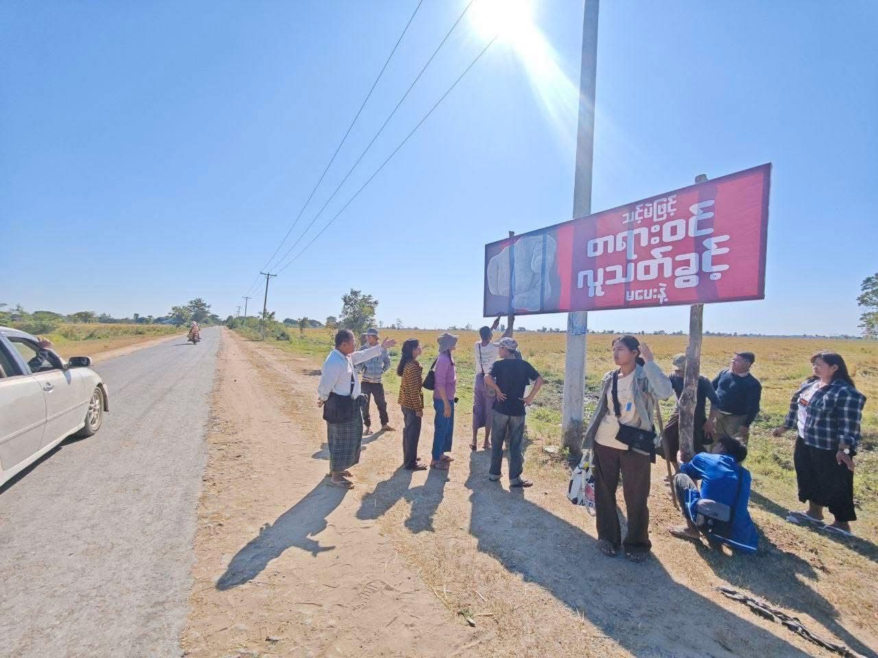 စစ်ကိုင်းတိုင်း လမ်းပိုင်းတစ်နေရာတွင် ရွေးကောက်ပွဲအတု ဆန့်ကျင်ကြောင်း စိုက်ထူထားသည့် ဆိုင်းဘုတ်တစ်ခု