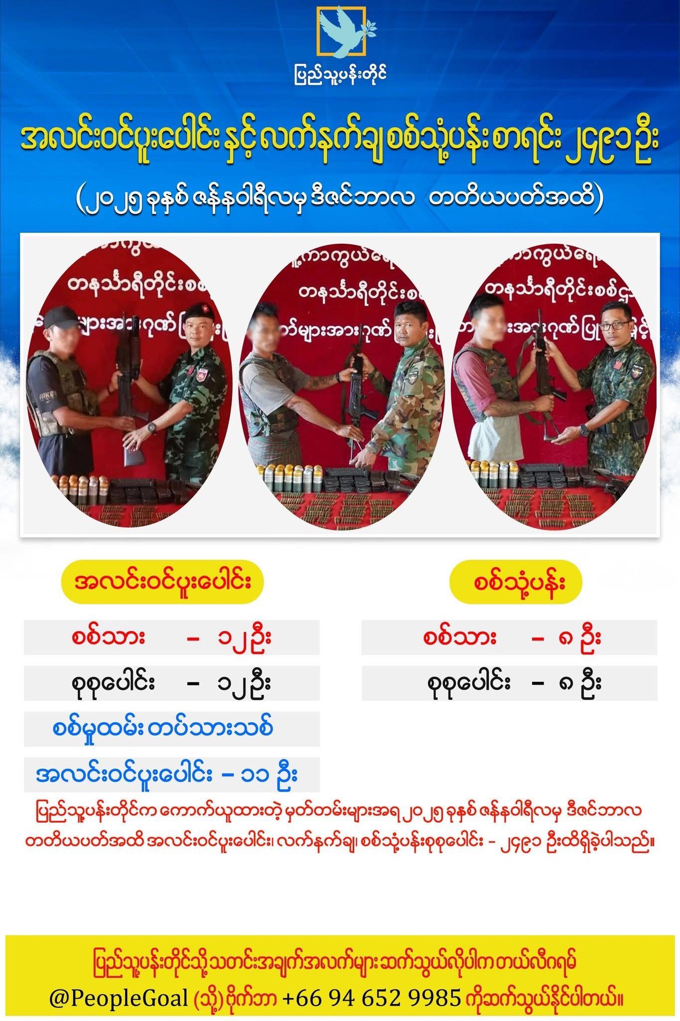 လက်ရှိ ၂၀၂၅ ခုနှစ် ဇန်နဝါရီလကနေ ဒီဇင်ဘာလ တတိယပတ်အထိ အကြမ်းဖက်စစ်တပ်ထံကနေ အလင်းဝင်ပူးပေါင်းသူ၊ လက်နက်ချသူနဲ့ စစ်သုံ့ပန်း အရေအတွက် စုစုပေါင်း ၂၄၉၁ ယောက် ရှိခဲ့တယ်လို့ ပြည်သူ့ပန်းတိုင်ကနေ ကောက်ယူထားတဲ့ အချက်အလက်တွေအရ သိရပါတယ်။