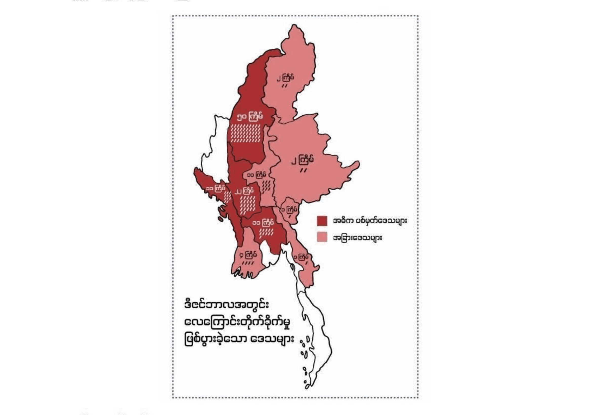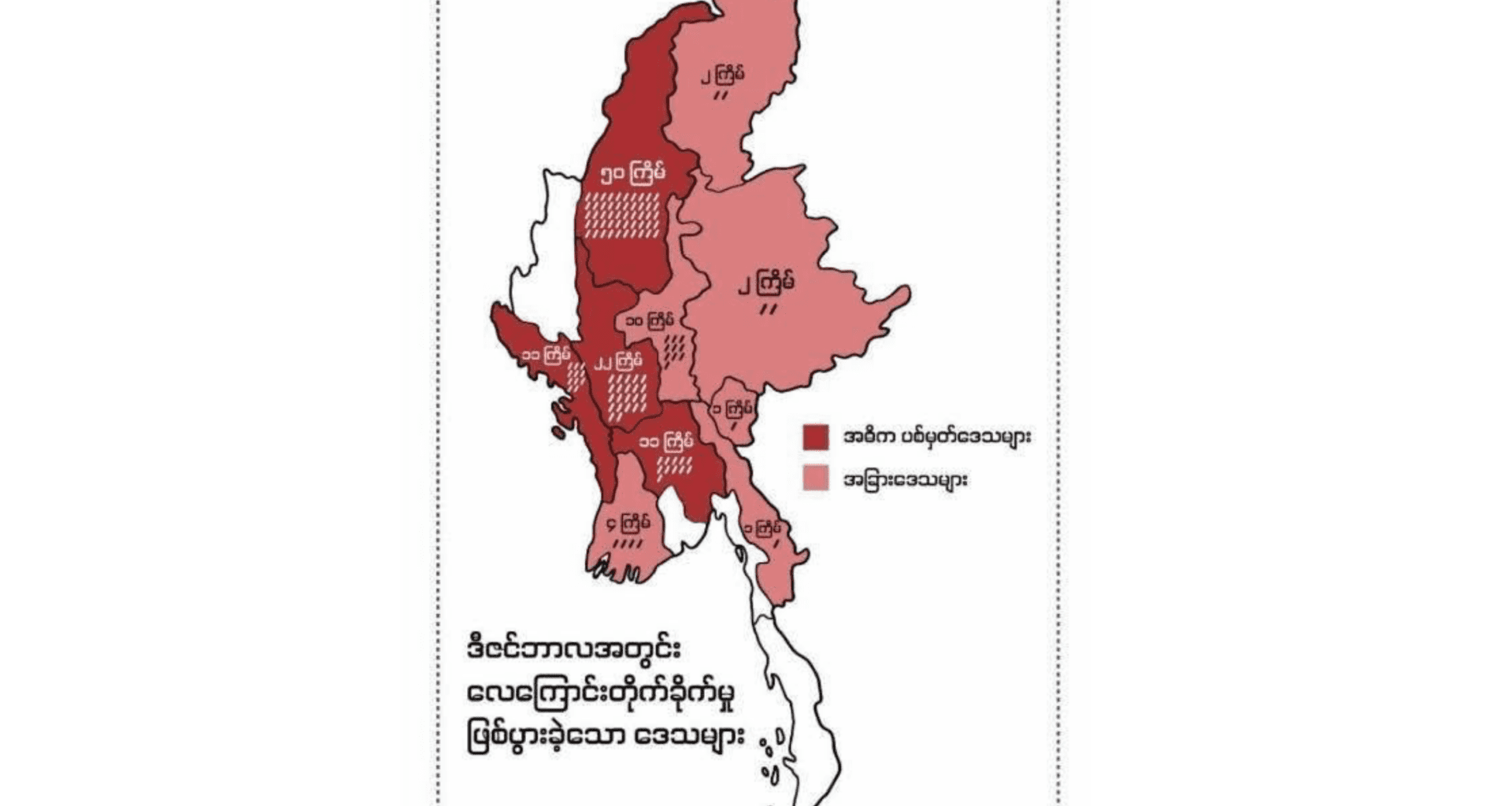 အကြမ်းဖက်စစ်တပ်ရဲ့ လေကြောင်းတိုက်ခိုက်ကျူးလွန်မှုကို စစ်ကိုင်း၊ မကွေး၊ ပဲခူးတိုင်း၊ ရခိုင်ပြည်နယ်နဲ့ မန္တလေး တိုင်းတွေမှာ အများဆုံး ကြုံတွေ့ခဲ့ရပြီး စစ်ကိုင်းတိုင်း နဲ့ ရခိုင်ပြည်နယ်တွေမှာ သေဆုံးမှုနဲ့ ထိခိုက်ဒဏ်ရာရရှိမှု အ မြင့်ဆုံးဖြစ်ခဲ့တယ်လို့ ဆိုပါတယ်။