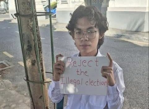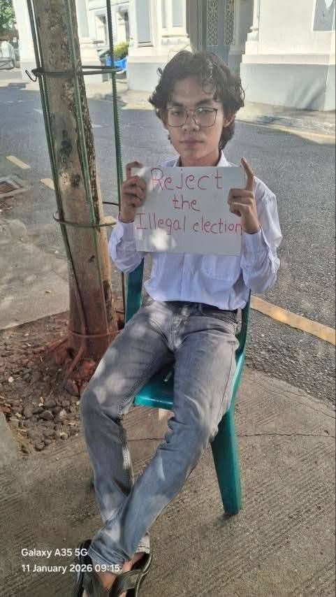 အကြမ်းဖက်စစ်တပ်ရဲ့ တရားမဝင်ရွေးကောက်ပွဲ အပိုင်း (၂) ကျင်းပနေချိန် ဇန်နဝါရီ ၁၁ ရက် မနက် ၉ နာရီလောက်မှာ အသက် (၂၁) အရွယ် ကိုမင်းထက်ဟာ ‘Reject the Illegal election’ စာတန်း ကိုင်ဆောင်ပြီး မြို့တော်ခန်းမရှေ့မှာ တစ်ကိုယ်တော် ဆန္ဒပြခဲ့တာ ဖြစ်ပါတယ်။