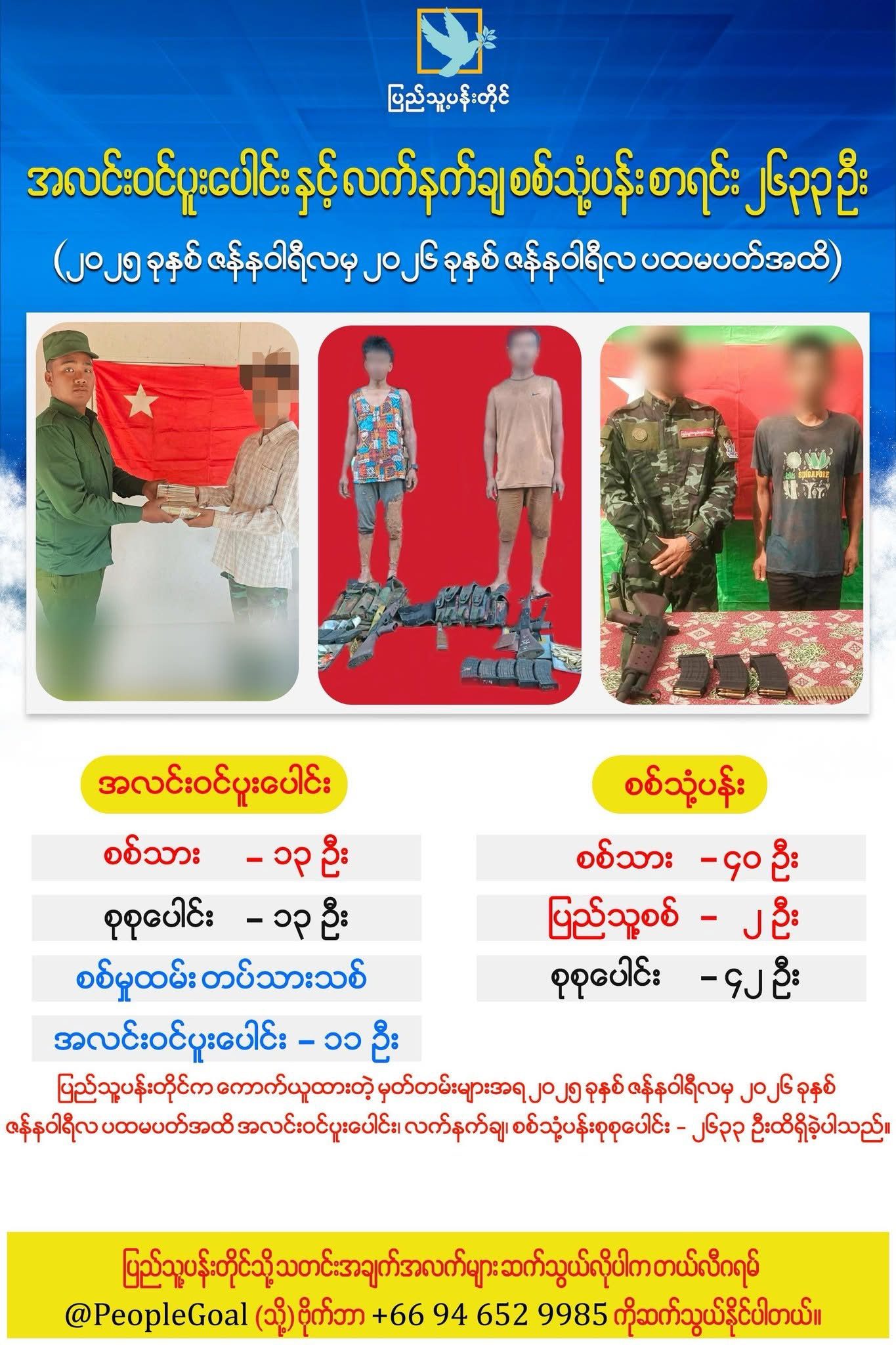 ၂၀၂၅ ခုနှစ်၊ ဇန်နဝါရီလကနေ  ဒီဇင်ဘာလအထိ အကြမ်းဖက်စစ်အုပ်စုကို စွန့်ခွာကာ လက်နက်ချ၊အလင်းဝင်ပူးပေါင်းနဲ့ စစ်သုံ့ပန်း စုစု‌‌ပေါင်း ၂၅၇၈ ယောက် အထိ ရှိခဲ့တယ်လို့ ပြည်သူ့ပန်းတိုင်က ထုတ်ပြန် ထားပါတယ်။