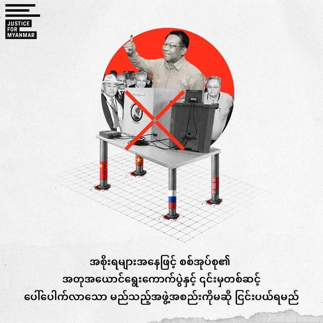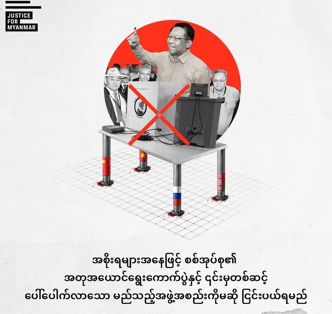 မြန်မာစစ်အုပ်စုက ကျင်းပခဲ့သော အတုအယောင် ရွေးကောက်ပွဲကနေ ပေါ်ပေါက်လာမယ့် ဘယ်အဖွဲ့အစည်းကိုမဆို နိုင်ငံတကာ အစိုးရတွေ အနေနဲ့ အသိအမှတ်မပြုဘဲ ပြတ်သားစွာ ငြင်းပယ်ဖို့ Justice For Myanmar (JFM) က ဇန်နဝါရီ ၂၆ ရက်နေ့မှာ တောင်းဆို လိုက်ပါတယ်။