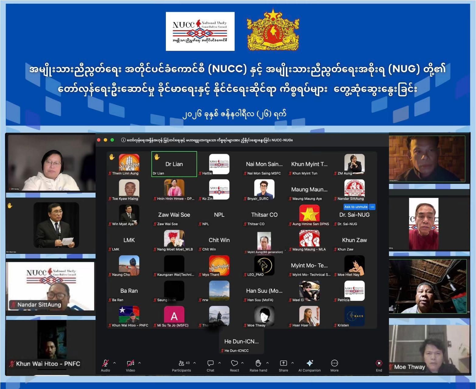 နွေဦးတော်လှန်ရေးကာလ လေးနှစ်ကျော်ရောက်ရှိလာချိန်မှာ အားကောင်းခိုင်မာတဲ့ တော်လှန်ရေးဦးဆောင်မှုတစ်ရပ် ပေါ်ပေါက်စေရေးအတွက် အမျိုးသားညီညွတ်ရေးအစိုးရ (NUG) နဲ့ အမျိုးသားညီညွတ်ရေးအတိုင်ပင်ခံကောင်စီ (NUCC) တို့ ဇန်နဝါရီ ၂၅ ရက်နေ့က လေးနာရီကြာ တွေ့ဆုံတယ်လို့ NUCC သတင်းထုတ်ပြန်ပါတယ်။