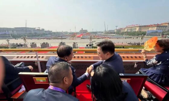 တရုတ်နိုင်ငံ၊ ဘေဂျင်းမြို့မှာ ဒီနေ့ ပြုလုပ်ကျင်းပတဲ့ ဖက်ဆစ်ဆန့်ကျင်ရေးစစ်ပွဲနဲ့ ဒုတိယကမ္ဘာစစ် အောင်နိုင်တဲ့ နှစ် ၈၀ ပြည့် စစ်ရေးပြအခမ်းအနားမှာ ဖက်ဆစ်အာဏာရှင် မင်းအောင်လှိုင်က အာဏာရှင်ခေါင်းဆောင်တွေနဲ့ ဖက်လှဲတကင်း တွေ့ဆုံခဲ့တဲ့ပုံရိပ်တွေကို နိုင်ငံတကာသတင်းဌာနတွေမှာ ဖော်ပြထားပါတယ်။